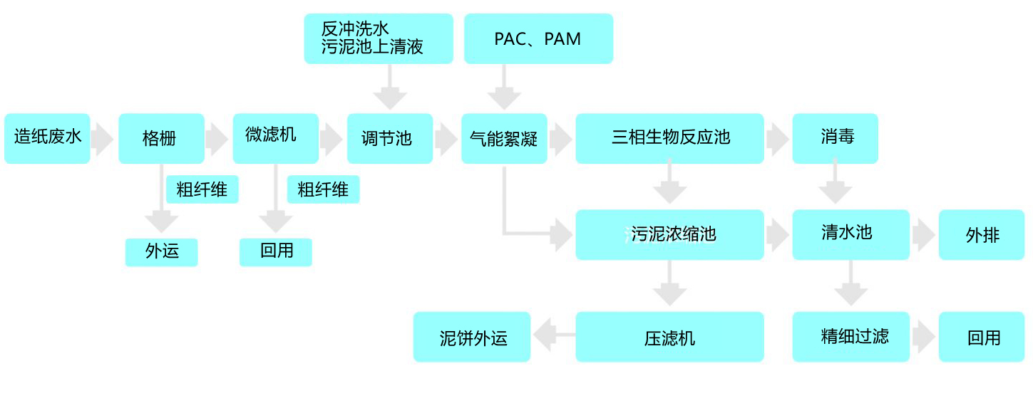 廢水通過格柵去除浮渣,經(jīng)由微濾機(jī)回收紙漿后進(jìn)入氣能絮凝系統(tǒng),通過投加混凝劑,再經(jīng)其凝聚、氣浮、撇渣、沉淀、刮泥處理后可去除污水中85% 以上的SS, 50%以上的非溶解性COD及部分溶解性COD和BOD。其出水進(jìn)入完全混合式曝氣池,通過向池內(nèi)補(bǔ)充投加N、P等營養(yǎng)物質(zhì),并利用吸附再生池增強(qiáng)回流污泥的微生物活性等方式高效降解污水中的有機(jī)物質(zhì)。出水經(jīng)由二沉池進(jìn)行固液分離,上清液消毒達(dá)標(biāo)后外排或精細(xì)過濾后回用。