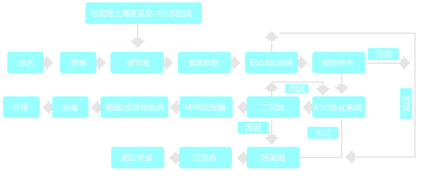 EGSB反應器、吸附再生池及二沉池產生的剩余污泥收集于污泥池,濃縮并經壓濾機脫水后外運。