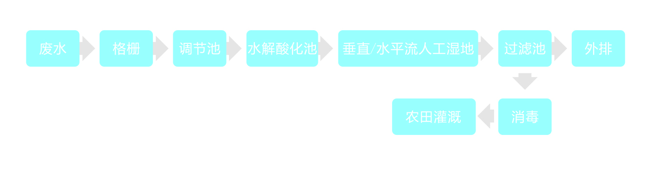 廢水經(jīng)格柵和調(diào)節(jié)池預(yù)處理后,進(jìn)入水解酸化池,污水中有機(jī)物通過(guò)附著在池內(nèi)填料中微生物膜的分解得到初步降解,固體懸浮物被沉降去除,有機(jī)物由大分子被分解成小分子而提高其可生化性。出水通過(guò)配水管網(wǎng)進(jìn)入垂直/水平流人工濕地系統(tǒng)的各個(gè)單元,利用土壤、人工介質(zhì)、植物、微生物的物理、化學(xué)、生物三重協(xié)同作用,其機(jī)理包括吸附、滯留、過(guò)濾、氧化還原、沉淀、微生物分解、轉(zhuǎn)化、各類植物對(duì)污水中營(yíng)養(yǎng)源的吸收等,以實(shí)現(xiàn)去除污水中COD、BOD、氮磷等各種污染物的目標(biāo),人工濕地系統(tǒng)出水由過(guò)渡池外排或消毒后用于景觀澆灑、沖洗道路、灌溉農(nóng)田等。