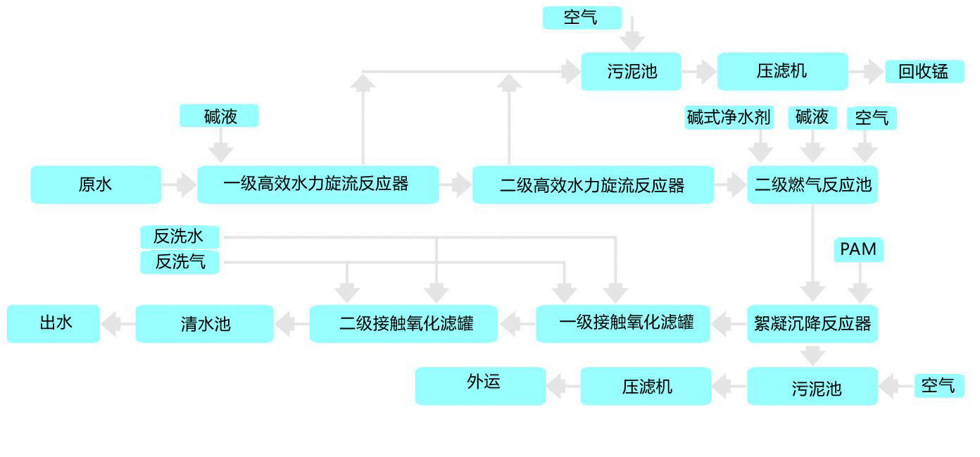 原水進(jìn)入兩級(jí)高效水力旋流反應(yīng)器,在進(jìn)水管道前投加藥劑調(diào)節(jié)PH值,在反應(yīng)器內(nèi)形成初級(jí)懸浮態(tài)水合錳氧化物,并在錐形分離區(qū)初步實(shí)現(xiàn)固液分離,上清液進(jìn)一步調(diào)節(jié)pH,充分曝氣后,水中殘余的錳離子轉(zhuǎn)化成水合MnO2及Mn(OH)2,在絮凝沉降反應(yīng)系統(tǒng)內(nèi)再次固液分離。出水經(jīng)二級(jí)“活性濾膜”自催化系統(tǒng)精細(xì)過(guò)濾,達(dá)到設(shè)計(jì)標(biāo)準(zhǔn)(錳≤2mg/L、鐵≤1mg/L)。