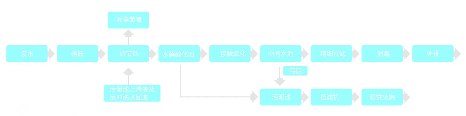 水解酸化池、中間水池內的污泥排入污泥池,通過壓濾機脫水后的泥餅經鍋爐焚燒(主要是殺滅污泥中含有的病菌、病毒、寄生蟲卵),或在泥餅中摻入石灰、植物秸桿攪拌均勻,堆放熟化滅菌,3個月后外運或填埋。