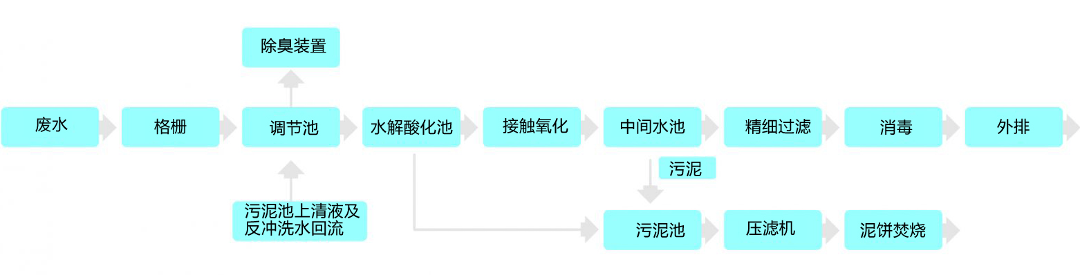 來自化糞池的污水經機械格柵去除大的浮渣后,進入調節池均勻水質、水量。調節池內的廢氣經生物除臭裝置處理后外排。出水進入水解酸化池,將大分子有機物轉化為小分子物質,降低COD負荷。接著進入接觸氧化池,污水中的有機污染物可被負載在填料上的生物膜高效降解,其出水經由中間水池固液分離,上清液經二級精細過濾、消毒后達標外排。